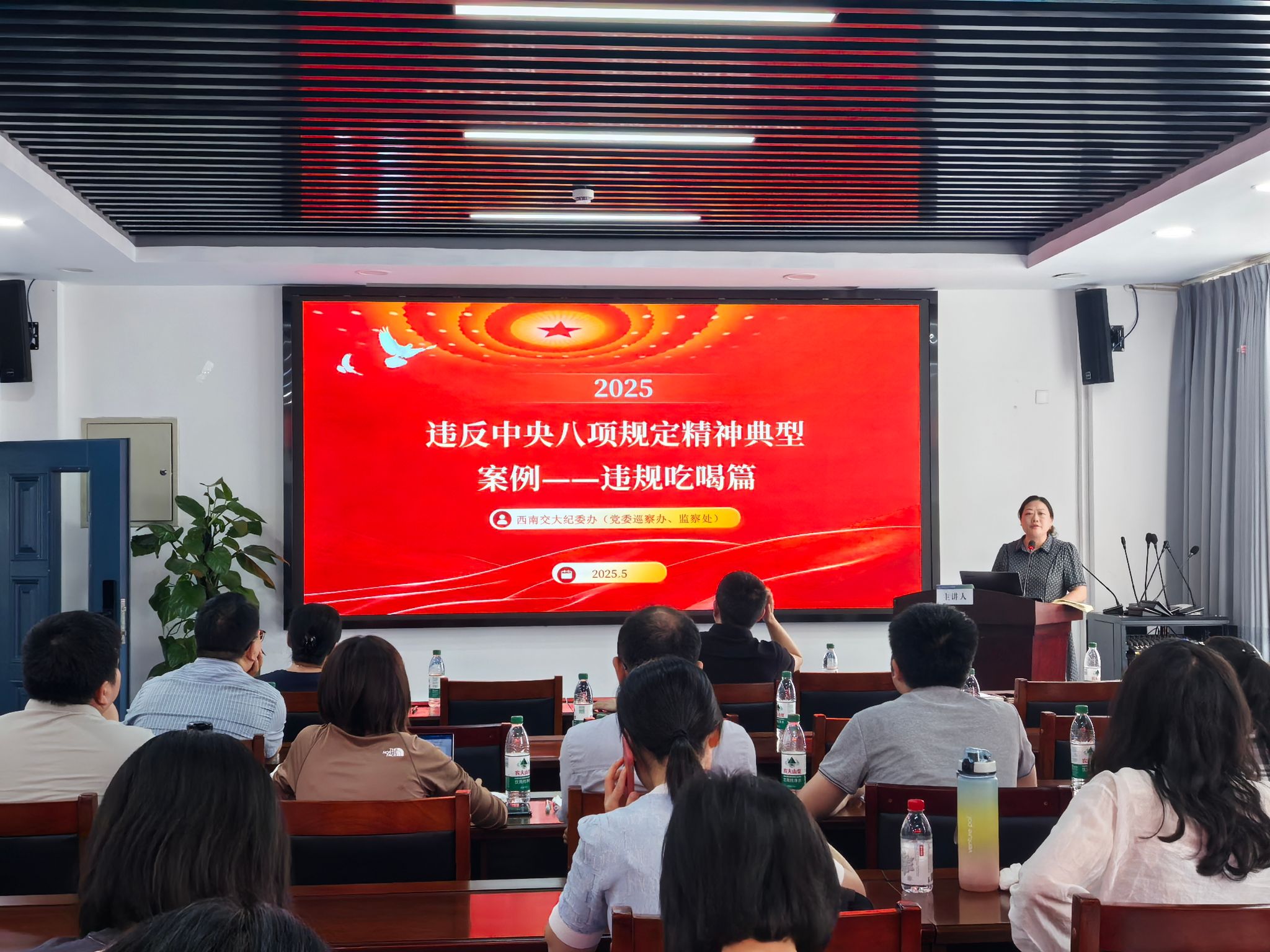 会议第三阶段,学院纪委开展警示教育学习会。张春燕副书记带领全体教职工学习《违反中央八项规定精神典型案例——违规吃喝篇》,通过阐明相关规定、剖析典型案例来强调违规吃喝的本质危害,告诫全体教职工要提高廉洁意识,筑牢思想防线,自觉抵制违规吃喝行为,切实维护高校教师清正廉洁的良好形象。