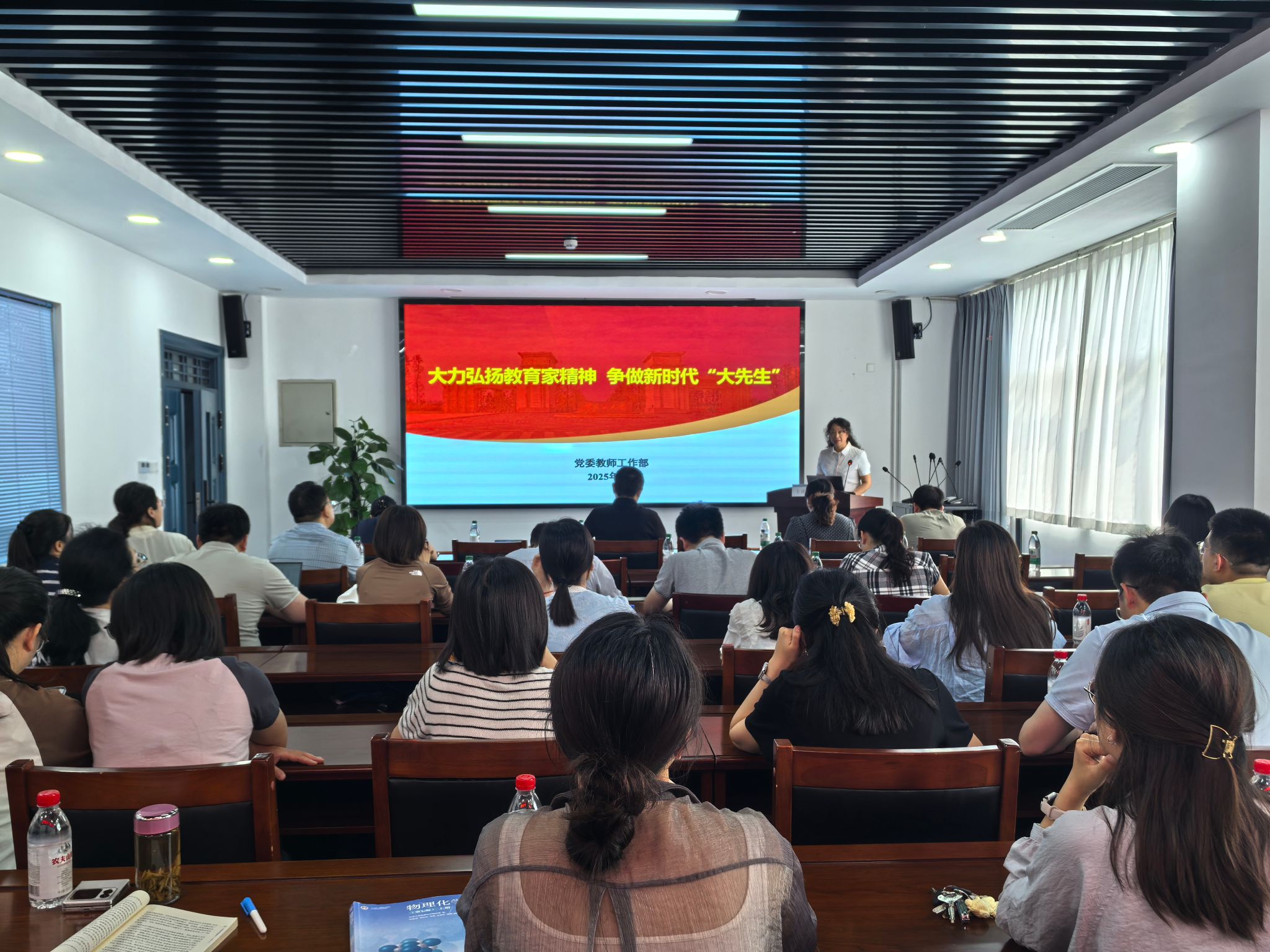会议第一阶段,来自党委教师工作部的李箐副部长以“大力弘扬教育家精神 争做新时代‘大先生’”为主题,对全院教职工进行宣讲。李箐以钱学森、黄大年、张桂梅等大家耳熟能详的教育家为例,通过讲述他们的感人事例深刻阐述教育家精神,号召教职工追求师德“高线”,自觉践行教育家精神;通过强调师德师风建设的重要性,阐释新时代高校教师职业行为十项准则和师德违规行为负面清单,劝诫教职工守住师德“标线”,以十项准则规范行为;通过剖析师德违规典型案例和师德违规处理方式,告诫教职工远离师德“红线”,以案为鉴,警钟长鸣。宣讲结束时,李箐号召全院教职工大力弘扬教育家精神,牢记为党育人、为国育才的初心使命,树立“躬耕教坛、强国有我”的志向和抱负,为强国建设、民族复兴伟业作出新的更大贡献。
