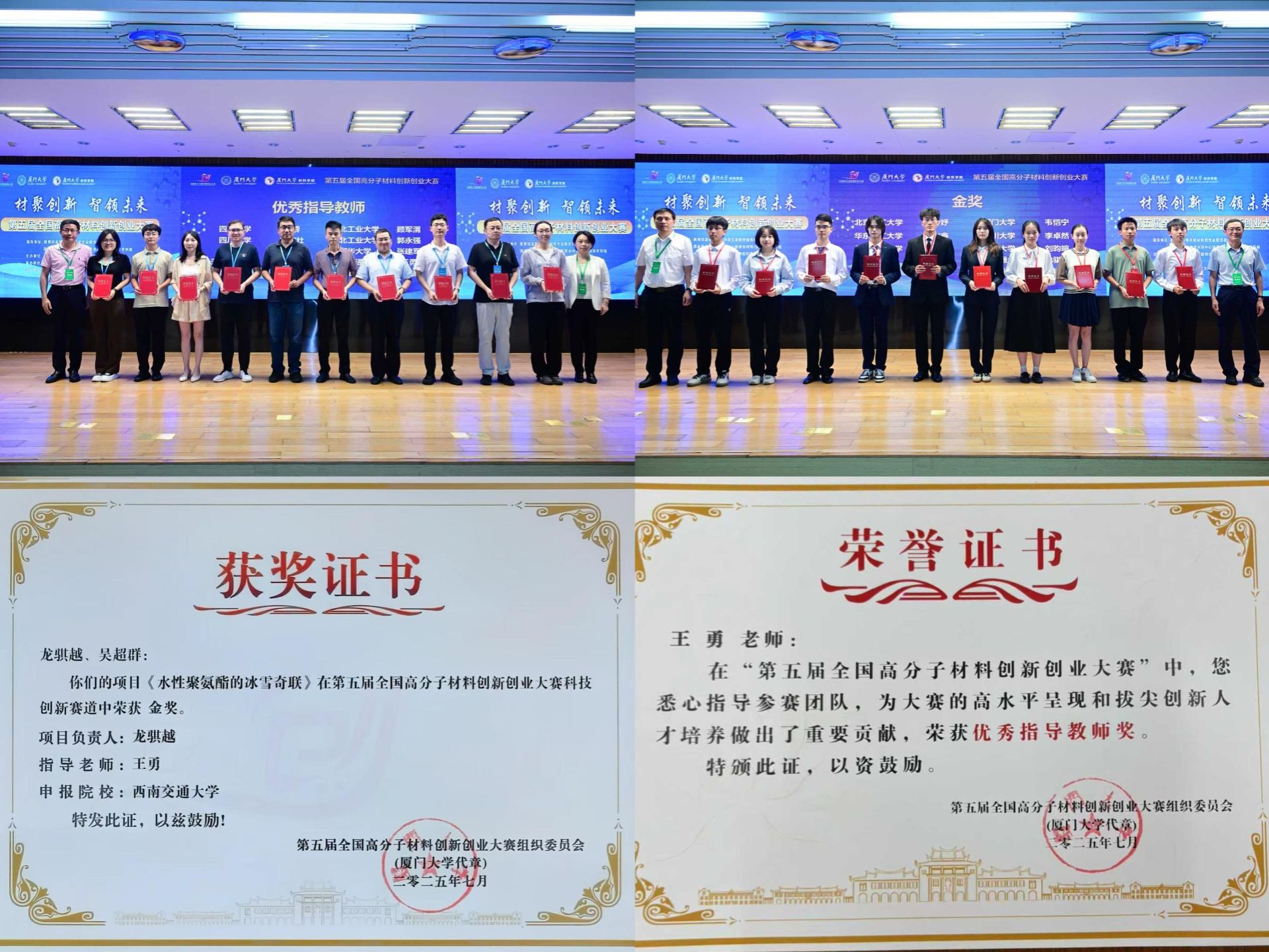 值得一提的是,龙骐越与吴超群两位同学均是王勇教授指导的“勇闯天涯”课题组员工。此次摘得全国金奖,是该课题组在2025年继第二届四川省节能减排社会实践与科技竞赛中斩获1项一等奖、2项二等奖后的又一重磅成果。从省级赛事的多点突破到全国大赛的巅峰问鼎,一连串亮眼成绩的背后,是课题组始终扎根科研一线、深耕创新沃土的执着坚守,更是团队在高分子材料领域持续探索、厚积薄发的实力彰显。