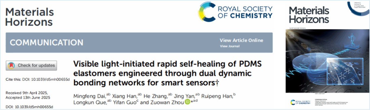 上述研究成果以“Visible light-initiated rapid self-healing of PDMS elastomers engineered through dual dynamic bonding networks for smart sensors”为题发表于材料领域知名期刊《Materials Horizons》,并以Inside Front Cover形式予以报道。论文第一作者为点点taptap官方网站博士生代明凤,导师周祚万教授为通讯作者。