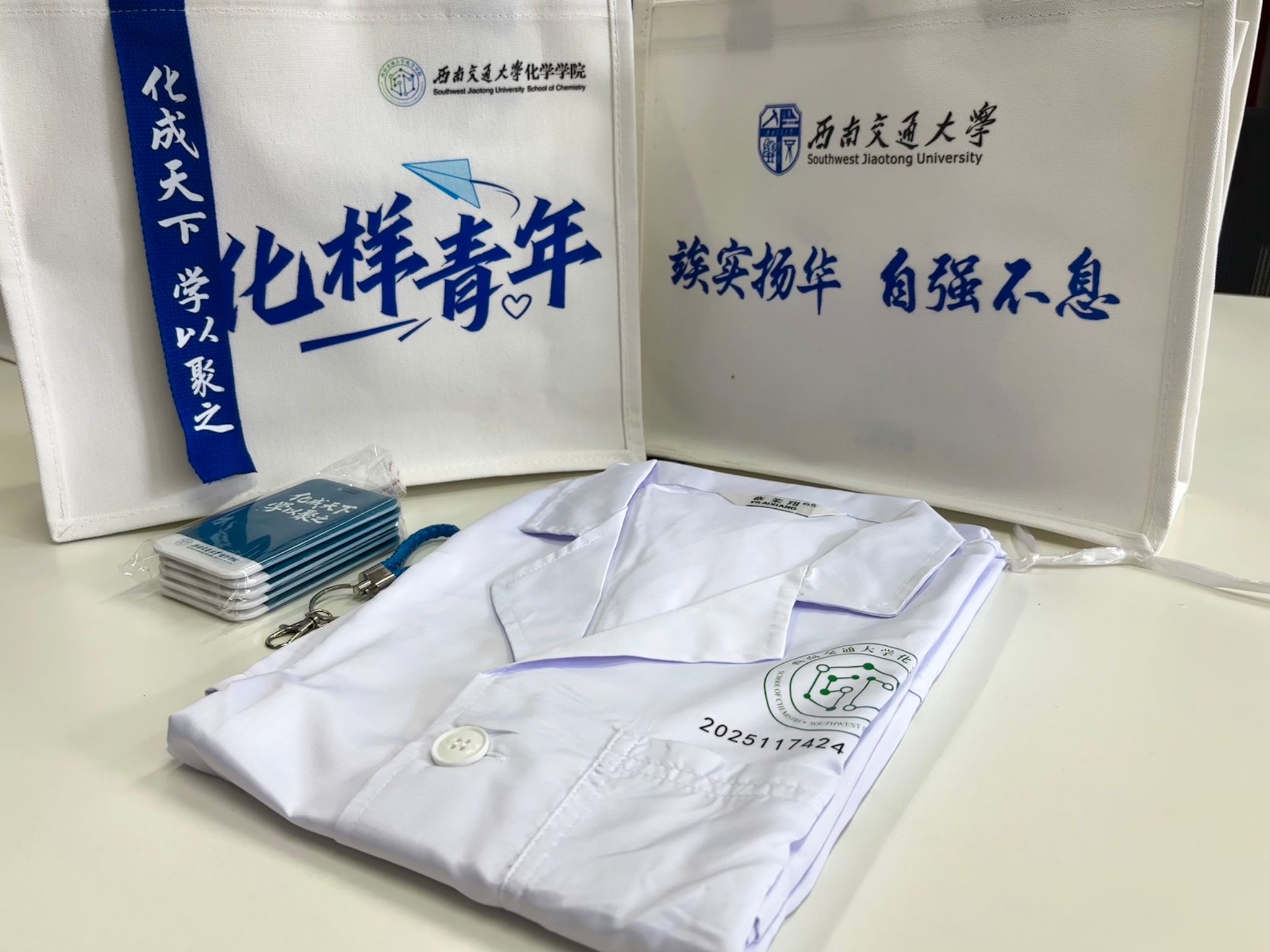 公司精心准备了新生大礼包,印有期许的帆布包、象征科研探索精神的实验服、文创小物件,它们无一不体现了交大特色、学院精神,是学院送给新生的 “第一份化学礼物”。