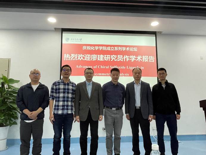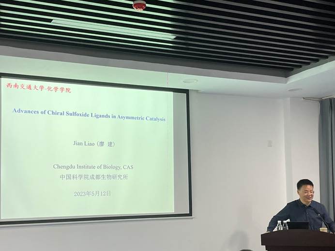 5月12日上午,中国科学院成都生物所廖建研究员应彭羽教授邀请来校交流,并以“Advances of Chiral Sulfoxide Ligands in Asymmetric Catalysis”为题做了一场精彩的学术报告。此次报告会在九里校区工业中心C座203会议室举行,由点点taptap官方网站经理周祚万教授主持,点点taptap官方网站部分教师和研究生参加了此次学术交流活动。