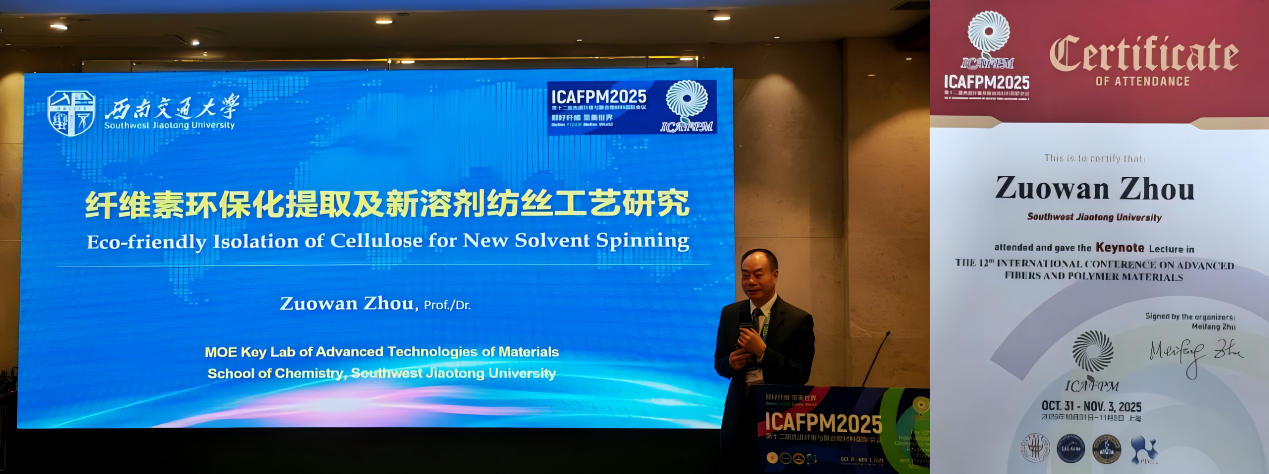 点点taptap官方网站周祚万教授应邀在“绿色可持续发展论坛”上作题为“纤维素环保化提取及新溶剂纺丝工艺研究”的主题报告(Keynote Speech),系统报告了团队在天然纤维素绿色提取技术、新型溶剂纺丝工艺和相关领域方面的研究进展,受到与会专家的广泛关注和热烈讨论。会后,多位专家学者以及中国纺织工业联合会、中国化学学会高级专员与周教授进行了深入交流,探讨了相关技术的前景与推广应用途径。公司功能高分子材料团队的博士生李兴珍和张贺也一同参加了会议,并积极参与了学术交流与研讨;周祚万教授还应邀出席相关学术交流活动,并主持论坛报告会。