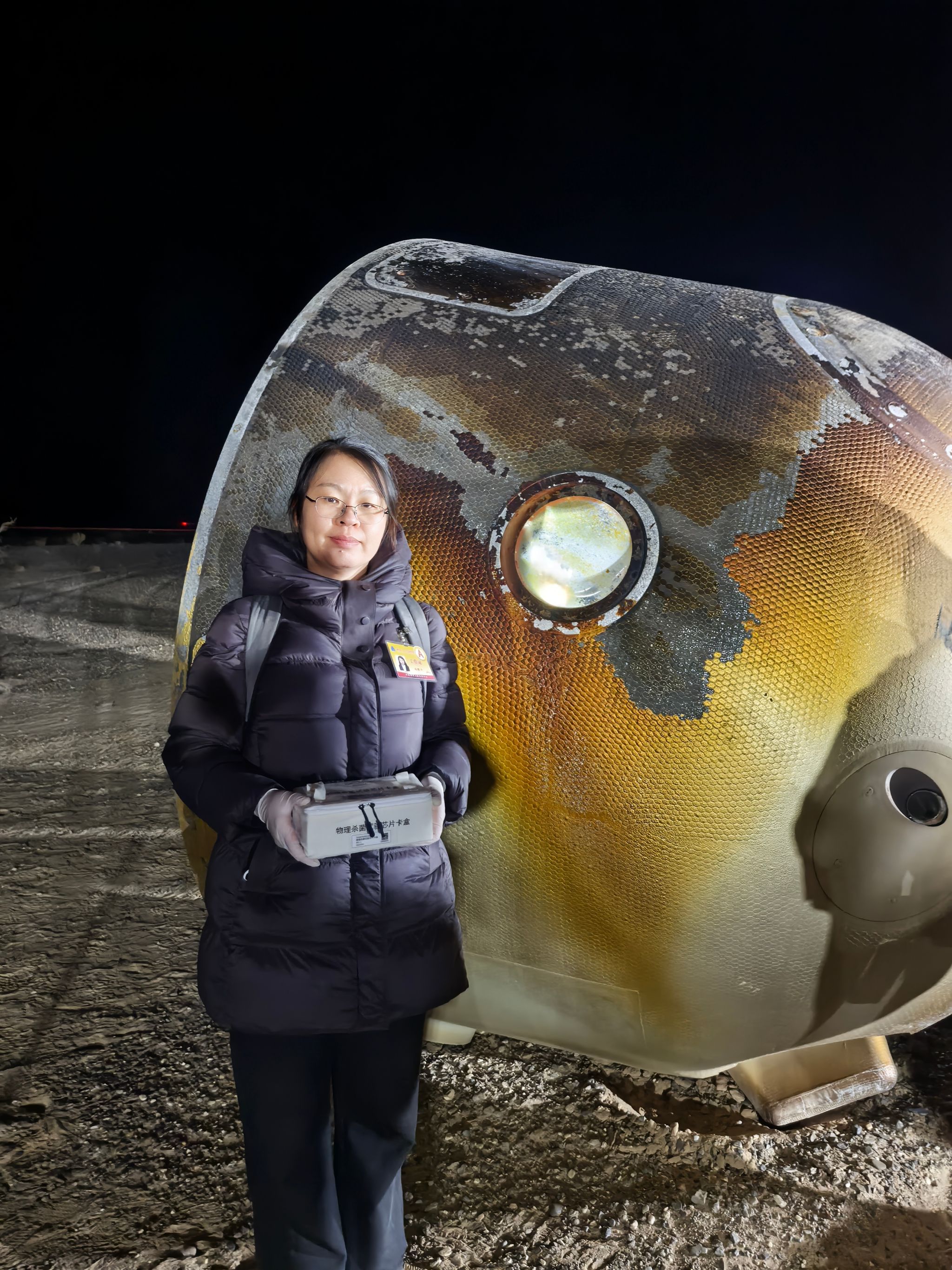 徐晓玲副教授手持接收的返回样品在返回舱前拍照留念