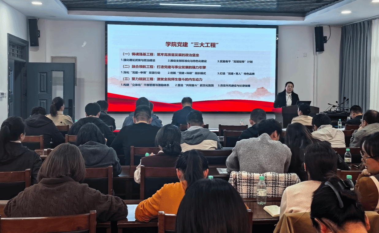 会上,张春燕书记围绕学院“党建工作磐石计划”,系统部署本学期党建工作。她强调,要紧扣学校“十五五”总体规划,坚持“一体引领、多点融合”工作思路,深入实施铸魂强基、融合领航、聚力赋能三大工程,全力构建党建与公司产品、科学研究、人才引育、团队建设深度融合的“一融双高”新格局。同时部署上半年理论学习、基层党组织标准化建设、党员发展教育等任务,强调尤其要绷紧师德师风和意识形态工作这两根弦,为学校各项事业发展提供坚实的思想保障和队伍支持;强调就业工作的重要性,要求导师切实履行就业指导责任。