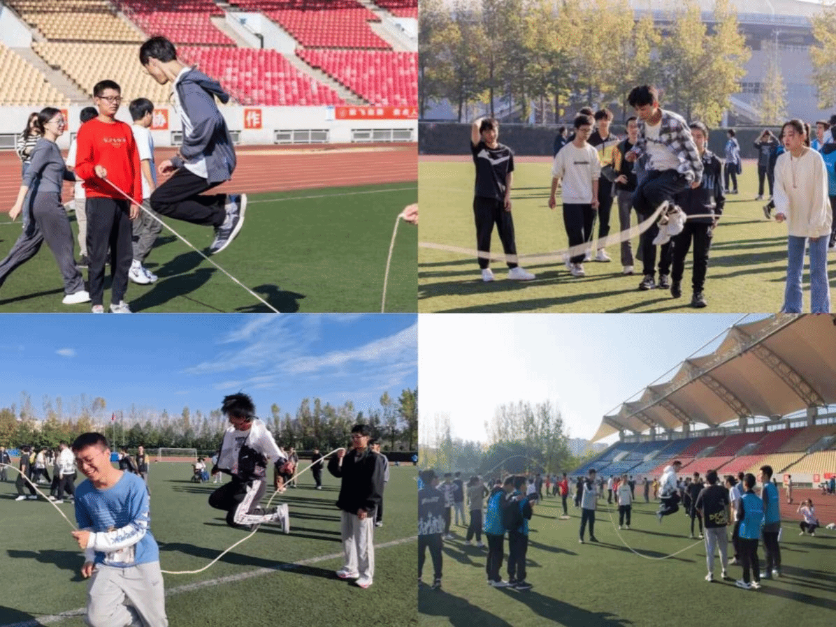 活动开始,全体师生根据事先分配好的组别在主席台前集合。操场上早已布置好八字跳绳、“风雨同舟”(长杆跑)、N人N足、“过河拆桥”、飞盘、拔河等多个项目场地,等待同学们的参与。