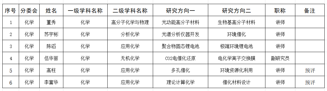 根据研究生院《关于进行2026年新增博士、硕士生指导教团队格遴选工作的通知》要求,经个人申请 、化学学位评定分委会审议通过,2026年拟新增硕士生指导教师名单公示如下:
