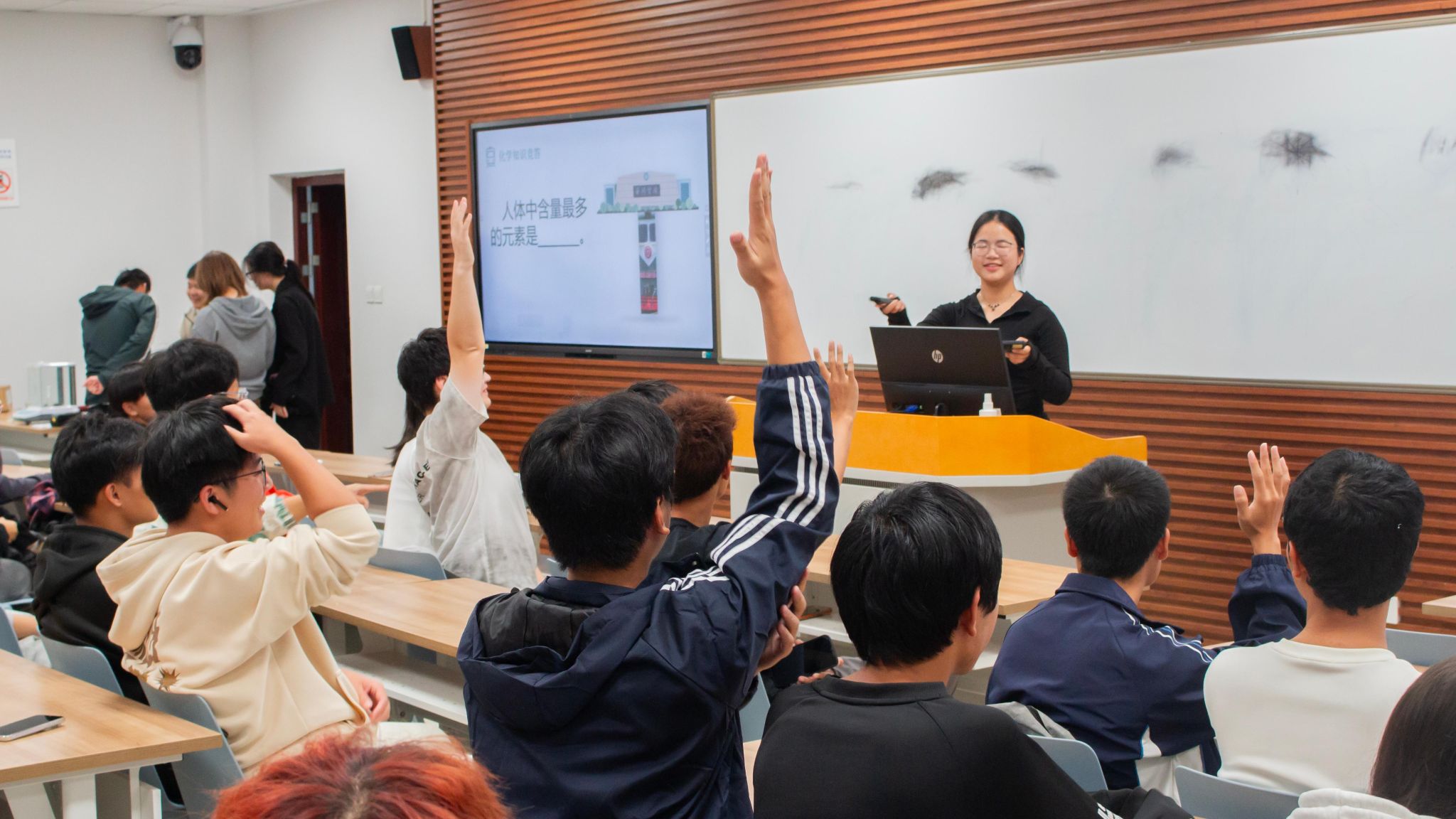 随着活动的进行,同学们越发投入其中:在你画我猜环节,同学们纷纷化为“灵魂画手”,一个个实验室常见的试剂仪器,或抽象或写实地跃然于黑板上,难记难写的名称从此深深烙印在同学们的脑海中……接下来的飞花令更是调动同学们的大脑飞速运转,来了一场诗意与化学的碰撞,诗里寻化,学蕴诗中。正话反说环节中,同学们的反应力超群,五支队伍竞争也逐渐激烈。