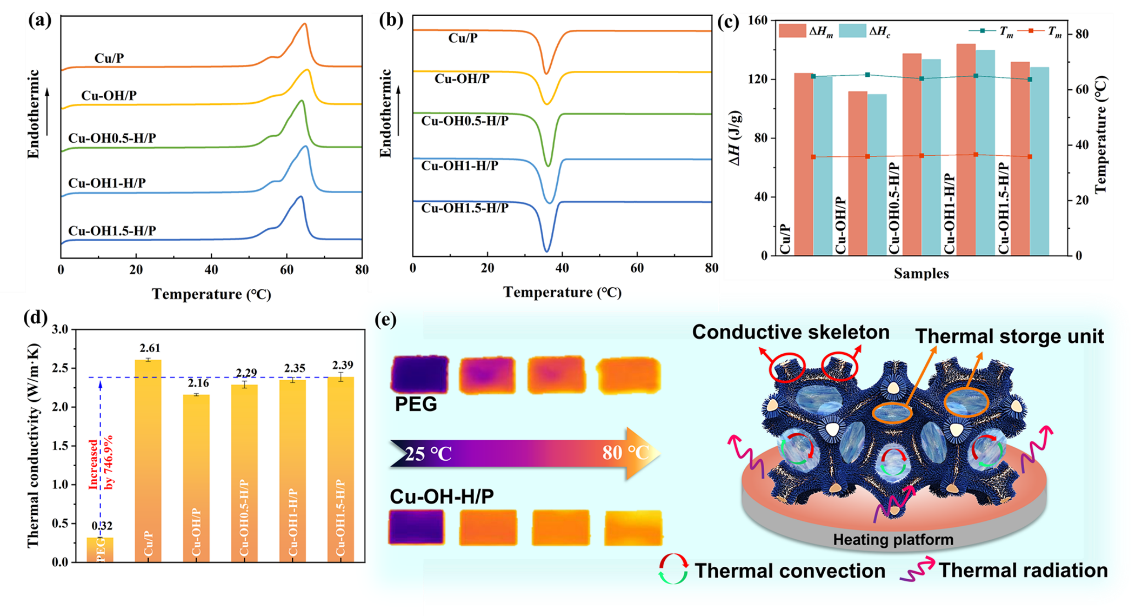 图4. Cu/P和Cu-OH-H/P的 (a) DSC升温曲线和 (b) 降温曲线。(c) 相变复合材料的热物理参数。(d) PEG, Cu/P和Cu-OH-H/P的导热系数。(e) Cu-OH-H/P的传热机理图。