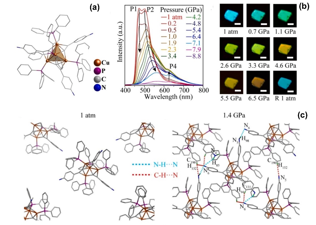 5. 外界压力引起Cu₄ 簇的荧光变化,其中簇间超分子作用的变化是关键因素。