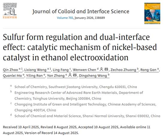 近日,公司张颜课题组在知名期刊《Journal of Colloid and Interface Science》(中科院一区,JCR一区,影响因子:9.4)上以点点taptap官方网站为第一通讯单位、山西师范大学为第二通讯单位发表题为“Sulfur form regulation and dual-interface effect: catalytic mechanism of nickel-based catalyst in ethanol electrooxidation”的研究论文。点点taptap官方网站硕士研究生赵芹和王利湘为共同第一作者,点点taptap官方网站张颜博士、山西师范大学陈雯雯副教授为共同通讯作者。