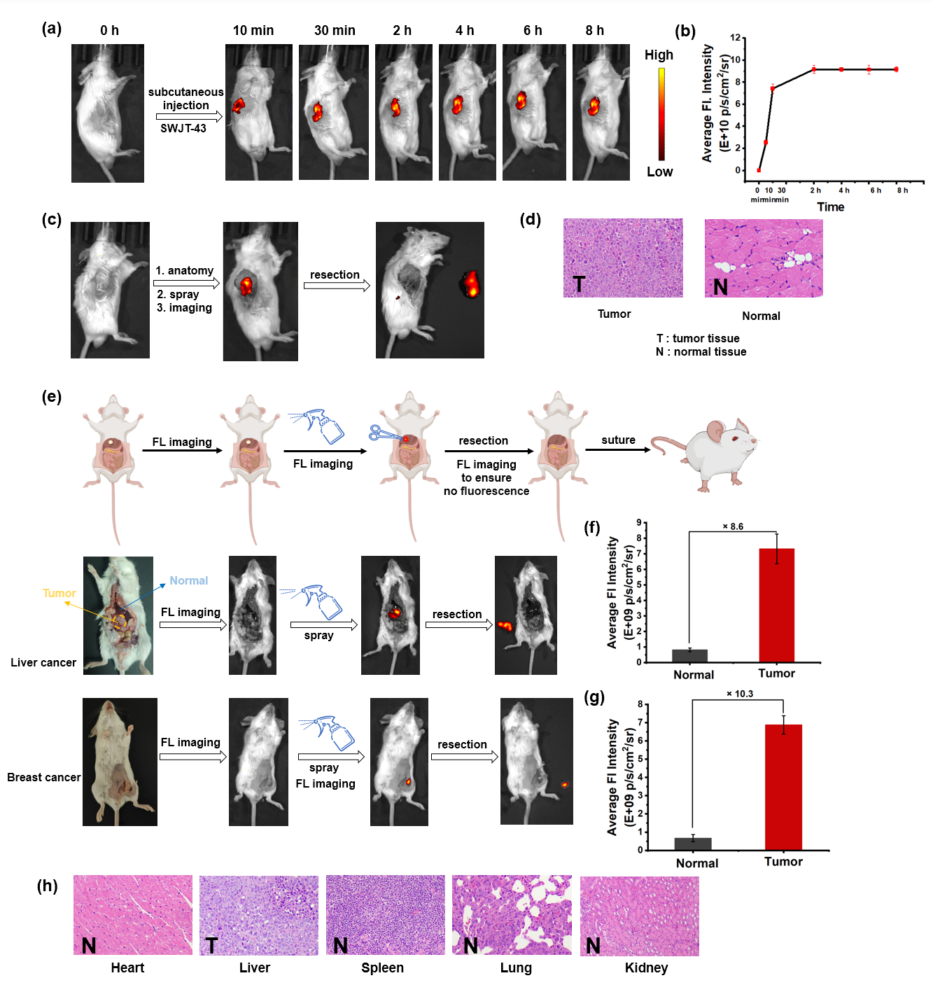 图5.SWJT-43引导小鼠皮下瘤及原位肝癌、乳腺癌肿瘤的切除及H&E染色分析