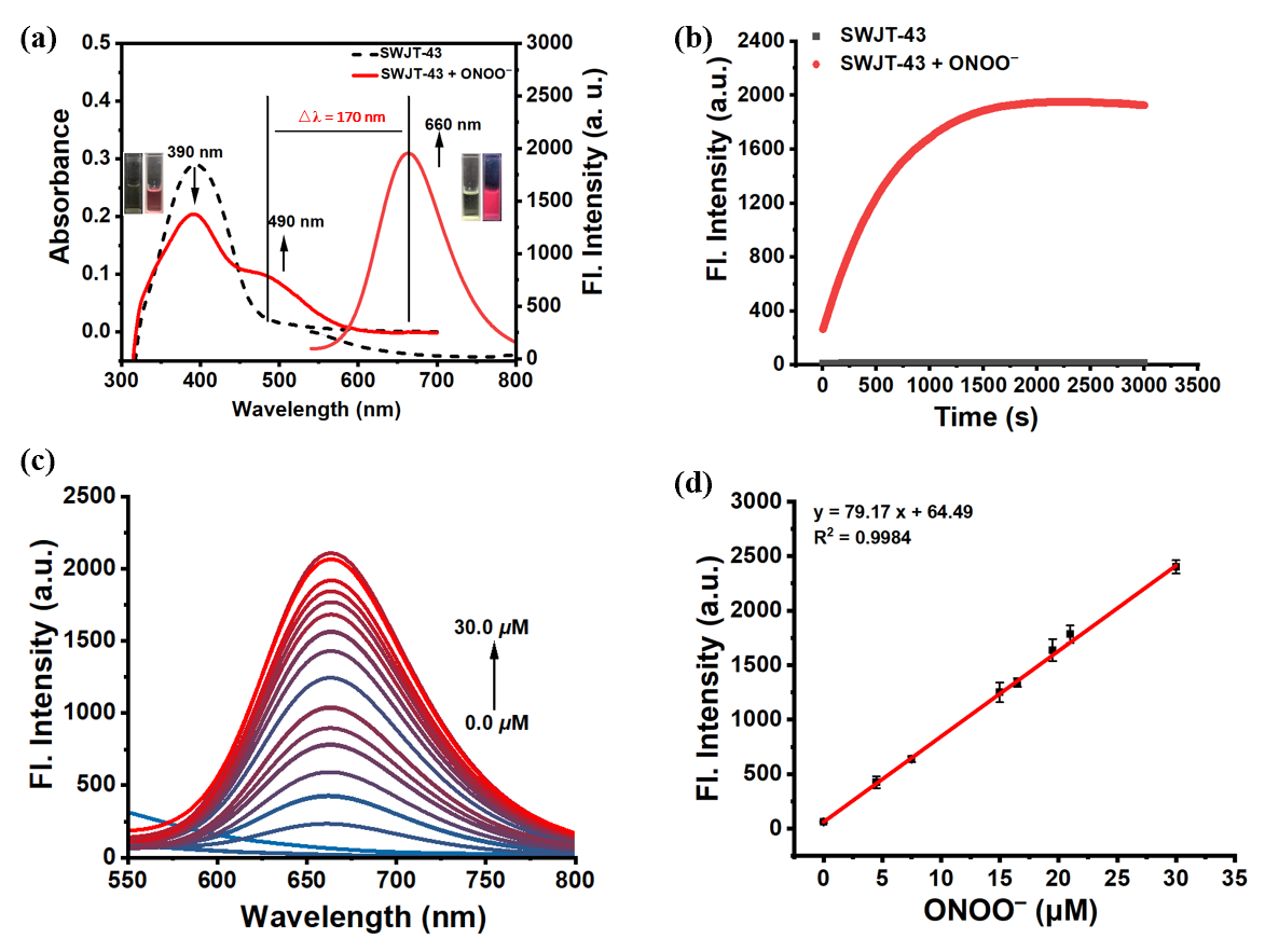 图4. SWJT-43对HCCLM3细胞及4T1细胞中内外源性ONOO⁻动态监测