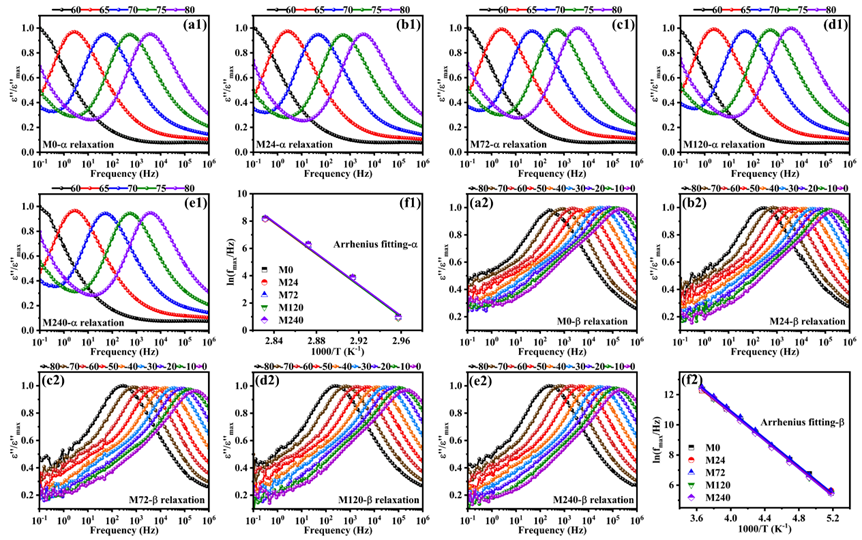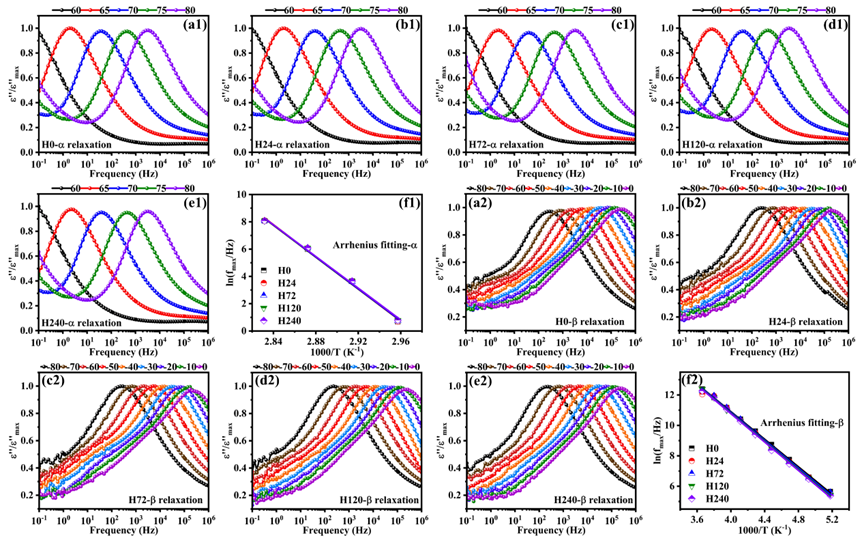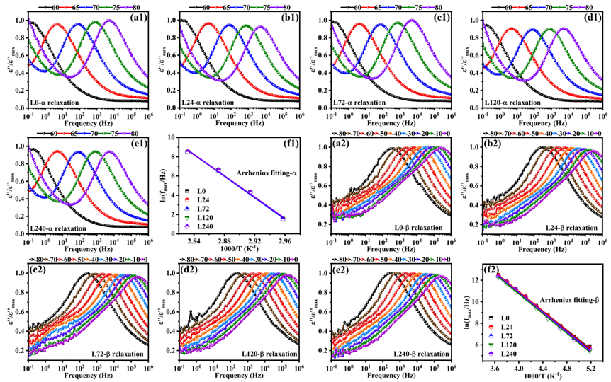 图5. 高分子量PLLA样品在(a1-e1) 60-80 ºC以及(a2-e2) -80-0 ºC温度范围内在不同物理老化时间下的介电损耗谱及(f1, f2)其Arrhenius线性拟合结果。