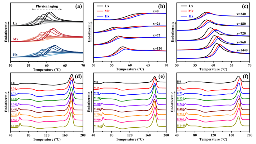 图2. (a)不同物理老化时间下低、中、高三种分子量PLLA样品的DSC一次升温曲线;(b, c)相同物理老化时间下不同样品之间DSC曲线的对比;(d, e, f)三种分子量PLLA样品DSC曲线随物理老化时间的变化情况。