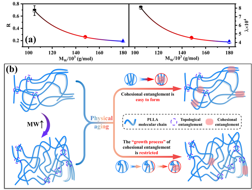 图7. 物理老化过程中样品(a)延展性的总体衰减速率和β松弛活化能的平均增长率随分子量的变化趋势。(b) PLLA物理老化过程中分子量调控机制示意图。