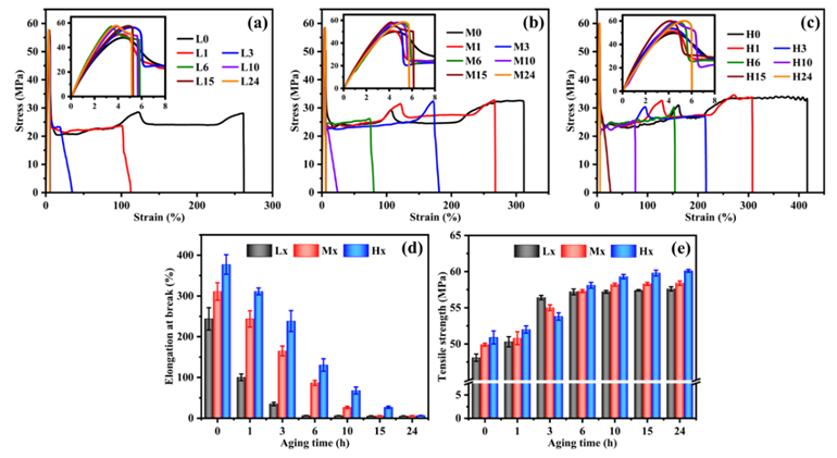 图1. (a)低、(b)中和(c)高分子量PLLA样品在不同老化时间下的应力-应变曲线;(d、e)不同样品的断裂伸长率和拉伸强度的比较。