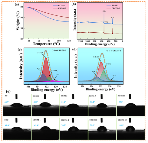图5 RC/M-2和CRC/M-2复合薄膜的(a) TGA曲线,(b) XPS全谱图;(c) RC/M-2, (d) CRC/M-2薄膜的O 1s的XPS谱图;(e) 不同薄膜的水接触角图