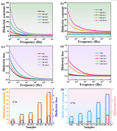图2 不同复合薄膜(a, c)介电常数,(b, d)介电损耗的频谱图;不同复合薄膜103时(e)介电常数,(f)介电损耗的对比