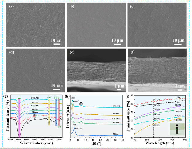 图1 (a) RC, (b) CRC,(c) RC/M-2, (d) CRC/M-2的表面扫描电镜图;(e) RC/M-2, (f) CRC/M-2的断面扫描电镜图;不同薄膜的(g) FT-IR图,(h) XRD图,(i) UV-vis图