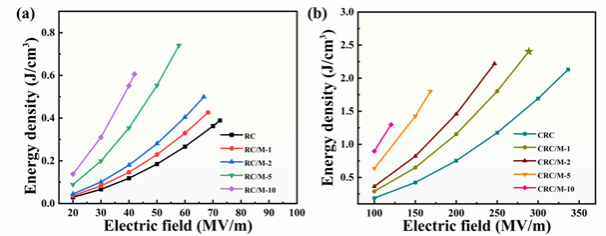 图4 (a) RC/M, (b) CRC/M薄膜储能密度图
