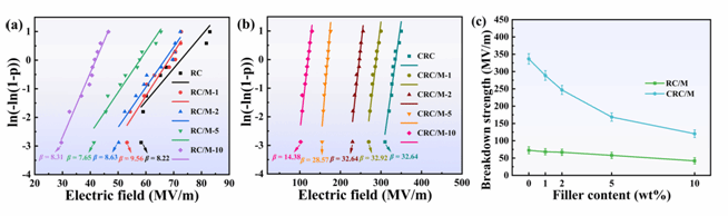 图3 (a) RC/M, (b) CRC/M薄膜击穿强度的威布尔分布图;(c) 不同复合薄膜击穿强度的对比