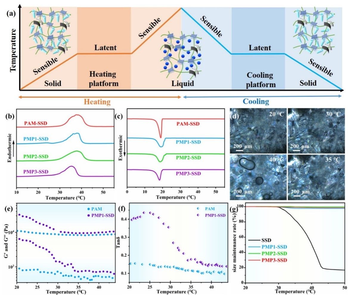 图2. (a)相变有机凝胶的潜热变化示意图。PAM-SSD和PMPχ-SSD在(b)升温和(c)降温过程中的DSC曲线。(d) PMP1-SSD在不同温度下的POM图像。PAM和PMP1-SSD在加热过程中的(e)