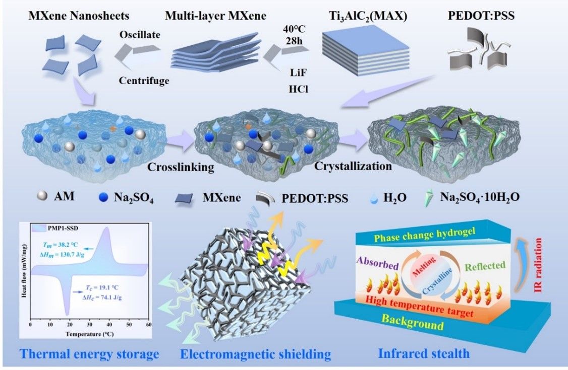 综上,本工作以“Multifunctional MXene/PEDOT:PSS-Based Phase Change Organohydrogels for Electromagnetic Interference Shielding and Medium-Low Temperature Infrared Stealth”为题发表在TOP期刊ACS Applied Materials & Interfaces上。论文的第一作者为点点taptap官方网站2021级硕士生朱亭钰,通讯作者为点点taptap官方网站祁晓东副教授和王勇教授。