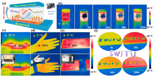图4. (a)相变有机凝胶的红外隐身机理图。(b)树叶形状的相变有机凝胶在温度升至60 °C时的红外热像图。不同中低温材料覆盖PMPχ-SSD相变凝胶的红外图像:(c)电脑、(d)手和(e)手机。(f)“SWJTU”形状的相变有机凝胶在温度升至60 °C时的红外热像图。