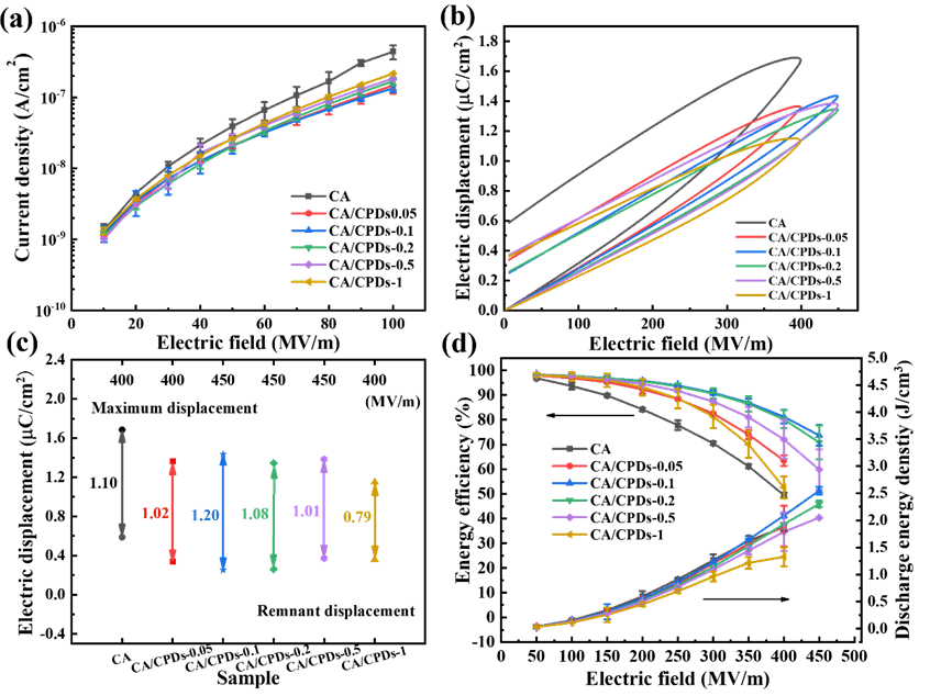 图6:(a) 电流密度变化;(b) 纯CA和CA/CPDs 薄膜在最大电场下的D-E循环;(c) 净极化参数;(d)纯CA和CA/CPDs 薄膜的充放电效率和放电能量密度。