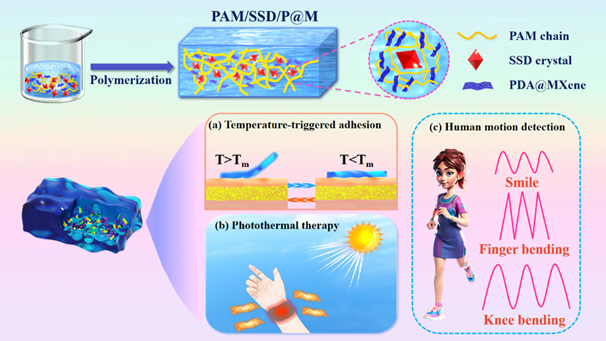 随着智能可穿戴设备在个人健康管理领域的快速发展,实时监测生理信号、提供个性化热管理和按需治疗的需求日益增长。然而,传统可穿戴设备存在舒适性差、粘附性能不足和功能单一等问题,限制了其在长期健康监测和光热治疗中的应用。因此,开发兼具优异应变感应、高效光热转换和可调控粘附性能的多功能材料,对于提升智能可穿戴设备的性能和扩展其应用范围具有重要意义。