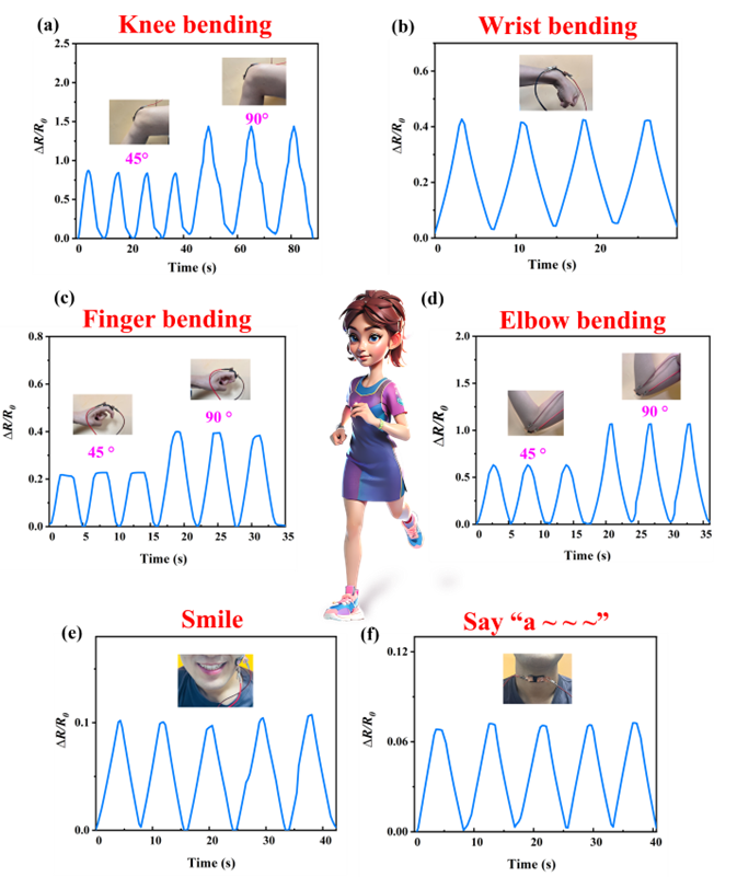 图6. PAM/SSD/P@M1.5凝胶作为人体运动的柔性可穿戴传感器。(a) 膝盖弯曲,(b) 手腕弯曲,(c) 手指弯曲,(d) 肘部弯曲,(e) 微笑,(f) 说“a~”。