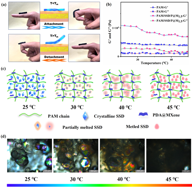 图4. (a) 不同温度下PAM/SSD/P@M1.5凝胶附着和脱离的数码照片。(b) PAM 和 PAM/SSD/P@M1.5 凝胶G′和G′′随温度升高的变化 (c) 凝胶内SSD晶态随温度变化的示意图。(d) 在偏光显微镜下将PAM/SSD/P@M1.5凝胶从25 °C加热到45 °C的图像。