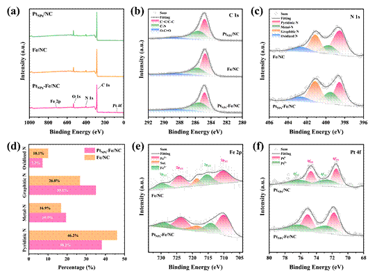 在这项工作中,作者基于Pt金属的电负性特征和尺寸效应对ORR路径的影响,构建了具有低含量Pt纳米颗粒修饰Fe-N-C的多尺度催化位点协同的双金属催化剂PtNPs-Fe/NC。研究表明,Pt 纳米颗粒和 Fe 金属位点之间存在显著的定向电子转移路径,这种定向电子转移促进了金属位点之间的协同电子效应,进而实现了对Fe位点周围电子密度的有效调控。结果显示,所制备的 PtNPs-Fe/NC 催化剂在ORR中表现出优异的催化活性,其半波电势(E1/2)达到了 0.901 V,优于商业 Pt/C、单金属催化剂 Fe/NC、PtNPs/NC 以及大多数已报道的催化剂。而且PtNPs-Fe/NC 的稳定性和甲醇耐受性也得到显著提升。进一步将制备的 PtNPs-Fe/NC 催化剂应用于自制的ZABs中。基于 PtNPs-Fe/NC 的液态ZABs实现了令人印象深刻的峰能量密度(201.48 mW cm-2)和超高的比容量(809 mAh g-1),接近ZABs的理论比容量(820mAh g-1),并且能够平稳地充放电超过 100 小时。此外,基于 PtNPs-Fe/NC 的柔性固态ZABs也表现出良好的放电能力和循环稳定性。该研究强调了多尺度催化活性位点构建在提升ORR催化剂性能中的作用,为储能设备中催化剂的设计提供了有价值的见解。
