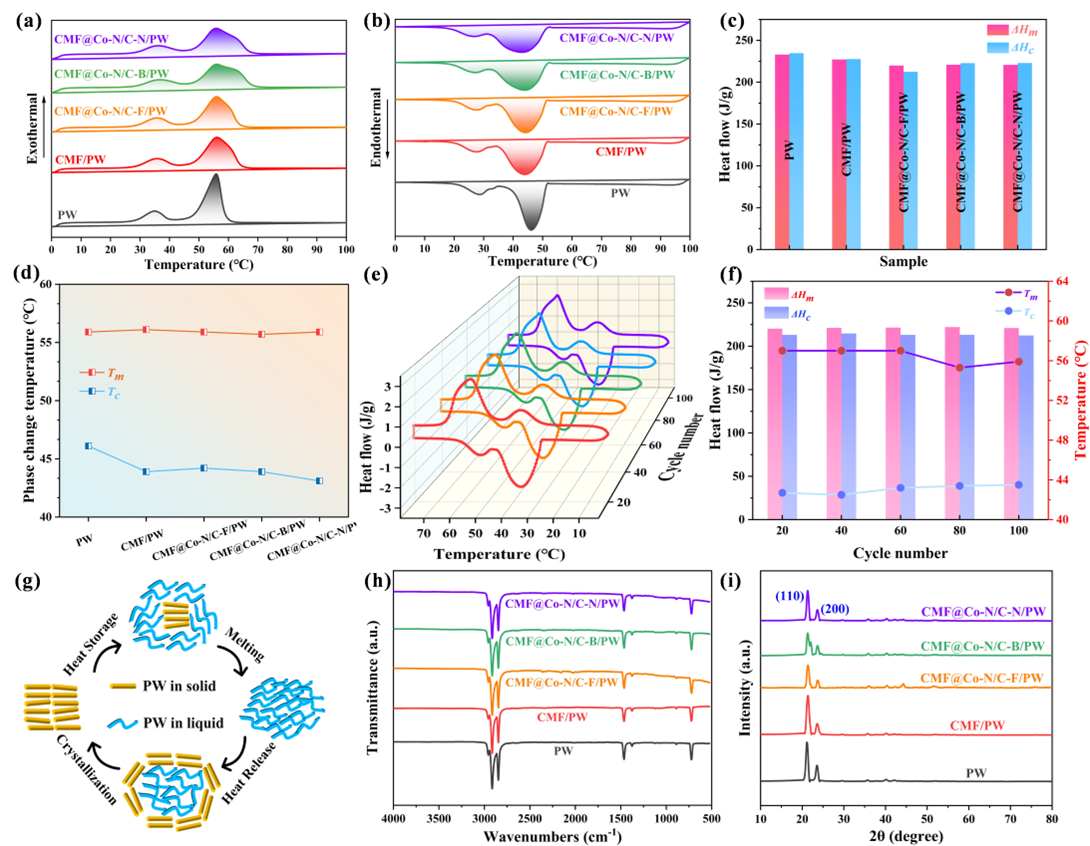 图4. PW、CMF/PW和CMF@Co-N/C/PW 的(a-b) 加热和冷却过程的DSC曲线,(c) 潜热值和(d) 相变温度;(e) CMF@Co-N/C-F/PW在加热冷却循环测试获得的DSC图和(f) DSC数据;(g) PCMs的热能吸收/释放示意图;PW、CMF/PW和CMF@Co-N/C/PW 的(h) FTIR光谱,(i)XRD谱图。