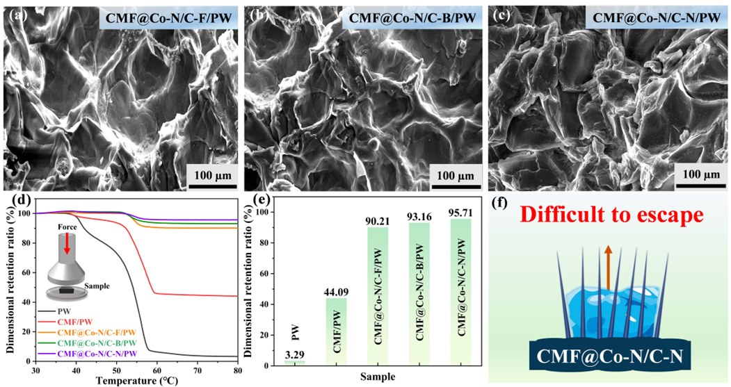 图3. (a-c) CMF@Co-N/C/PW的SEM图像;PW、CMF/PW和CMF@Co-N/C/PW 的(d) 恒压加热时的尺寸维持率曲线和(e) 80 ℃时的尺寸维持率参数;(f) 防泄漏机理示意图。
