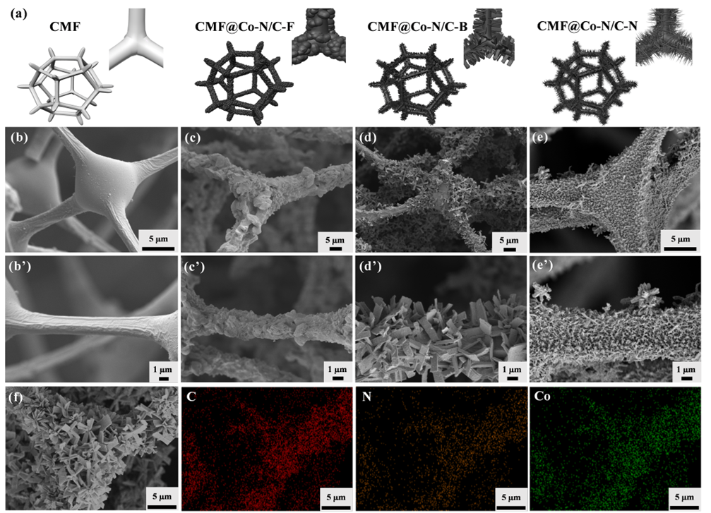 图2. (a) CMF和CMF@Co-N/C的形貌示意图;(b, b’) CMF, (c, c’) CMF@Co-N/C-F, (d, d’) CMF@Co-N/C-B, (e, e’) CMF@Co-N/C-N的微观形貌;(f) CMF@Co-N/C-B的EDS元素映射图。