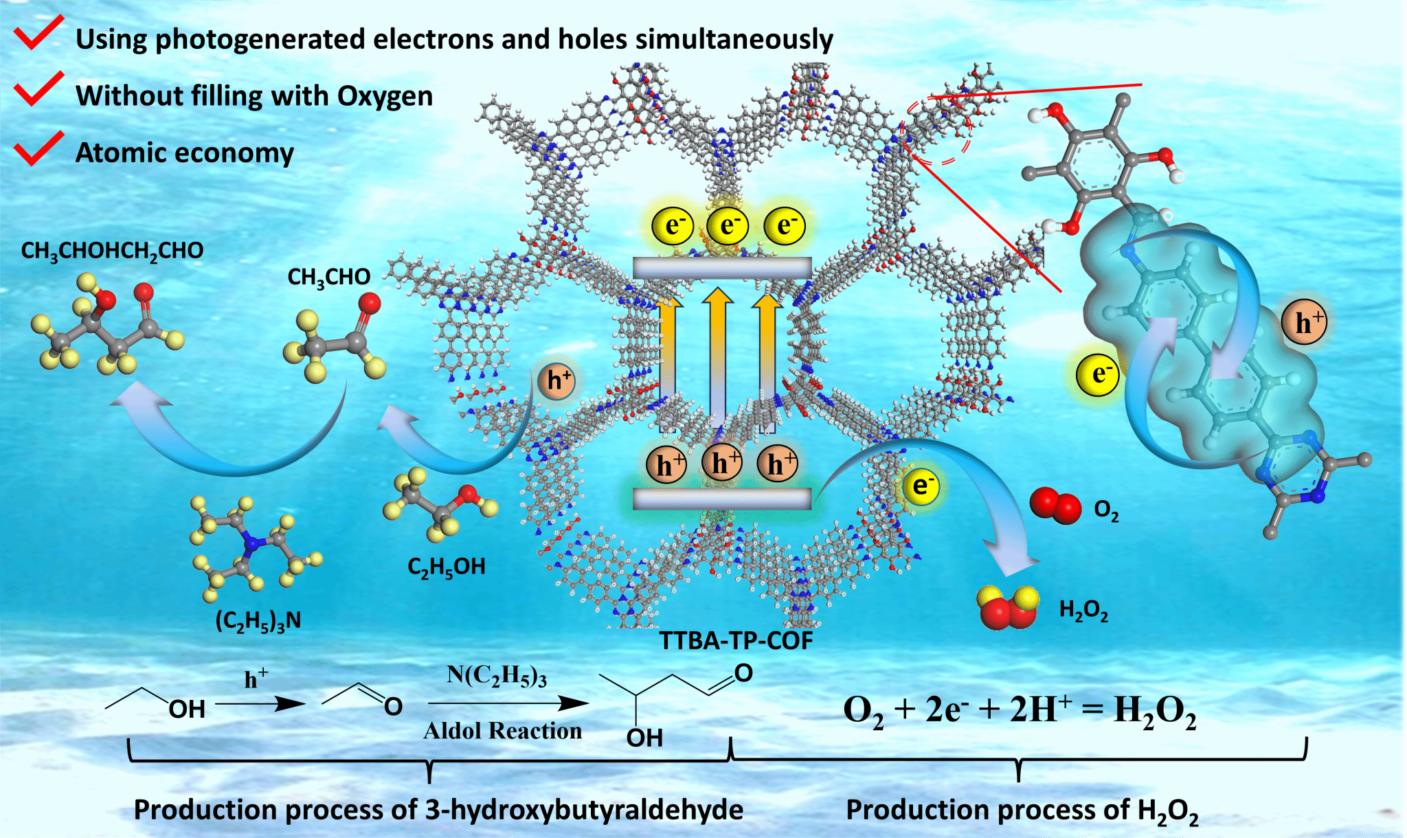 图1. TTBA-TP-COF光催化生产过氧化氢和协同催化3-HBA示意图