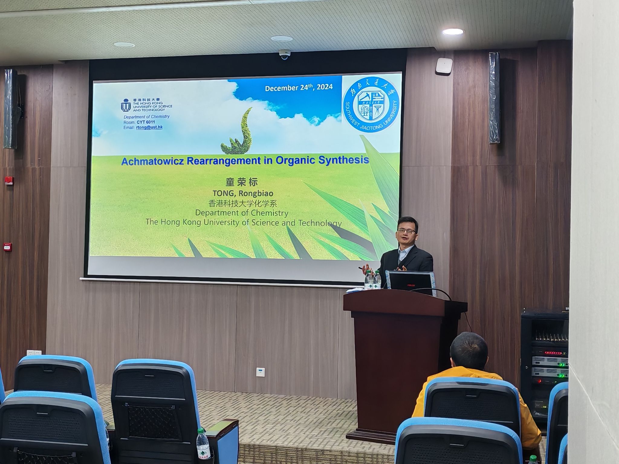 2024年12月24日上午,香港科技大学童荣标教授应公司邀请,于工业中心C座103报告厅开展以“Achmatowicz重排反应在有机化学中的应用”为主题的“创源”大讲堂研究生学术报告。报告由彭羽教授主持,郑剑峰副教授、刘祥伟副教授、肖检博士以及众多学院研究生参加了此次学术交流活动。