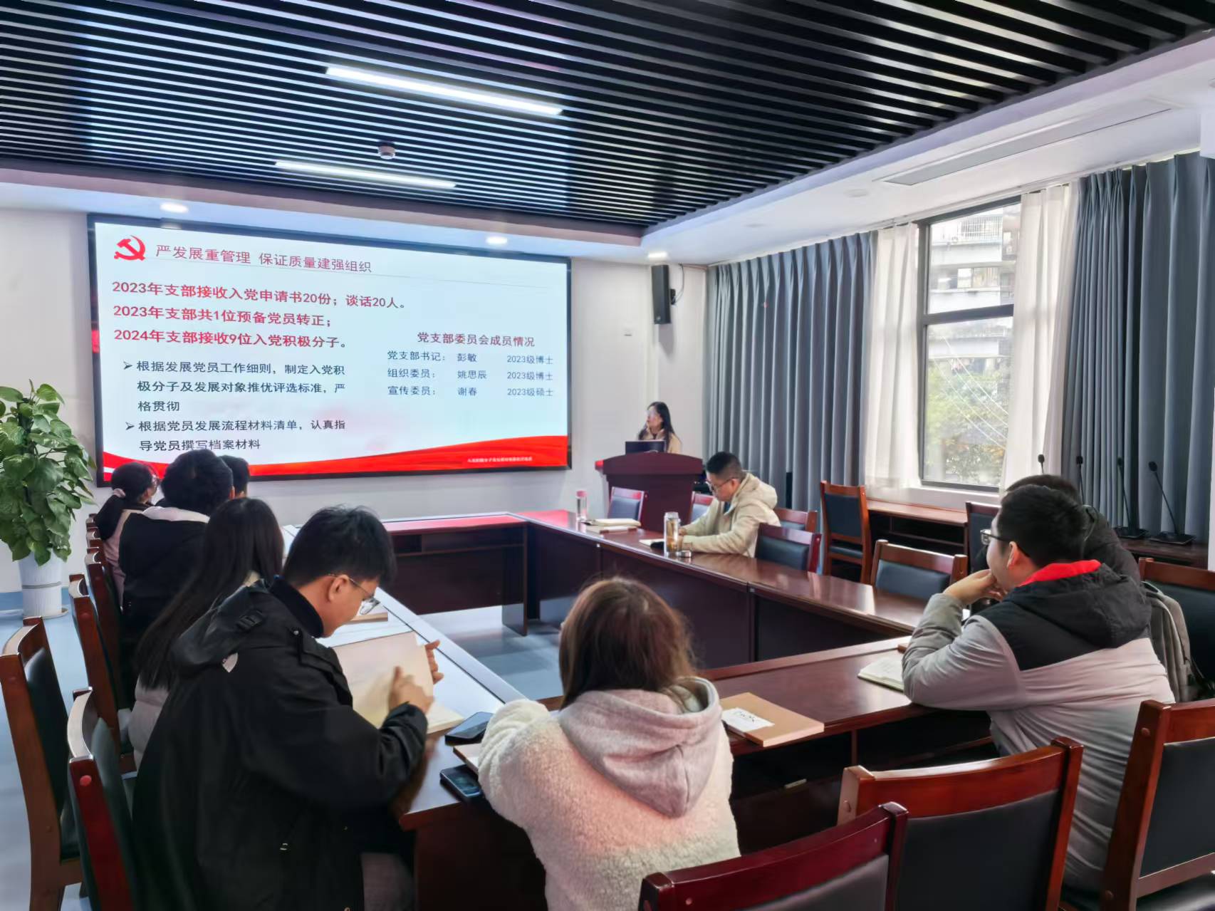 首先,2022级研究生党支部、2023级研究生党支部、2024级研究生党支部书记依次汇报了支部工作开展情况,包括支部建设成果以及支部工作堵点、难点。与会党员骨干还逐一汇报了个人学习、工作情况,如毕业要求的论文发表进度、实验开展情况、专利发表成果、是否存在科研压力,以及硕转博等学制变化、学籍归属转变、所属导师等。
