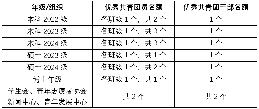(3)优秀共青团干部:各团支部可推荐1名优秀共青团干部拟推荐人选,学院团委按照名额分配组织评选,确定最终推荐人选。
