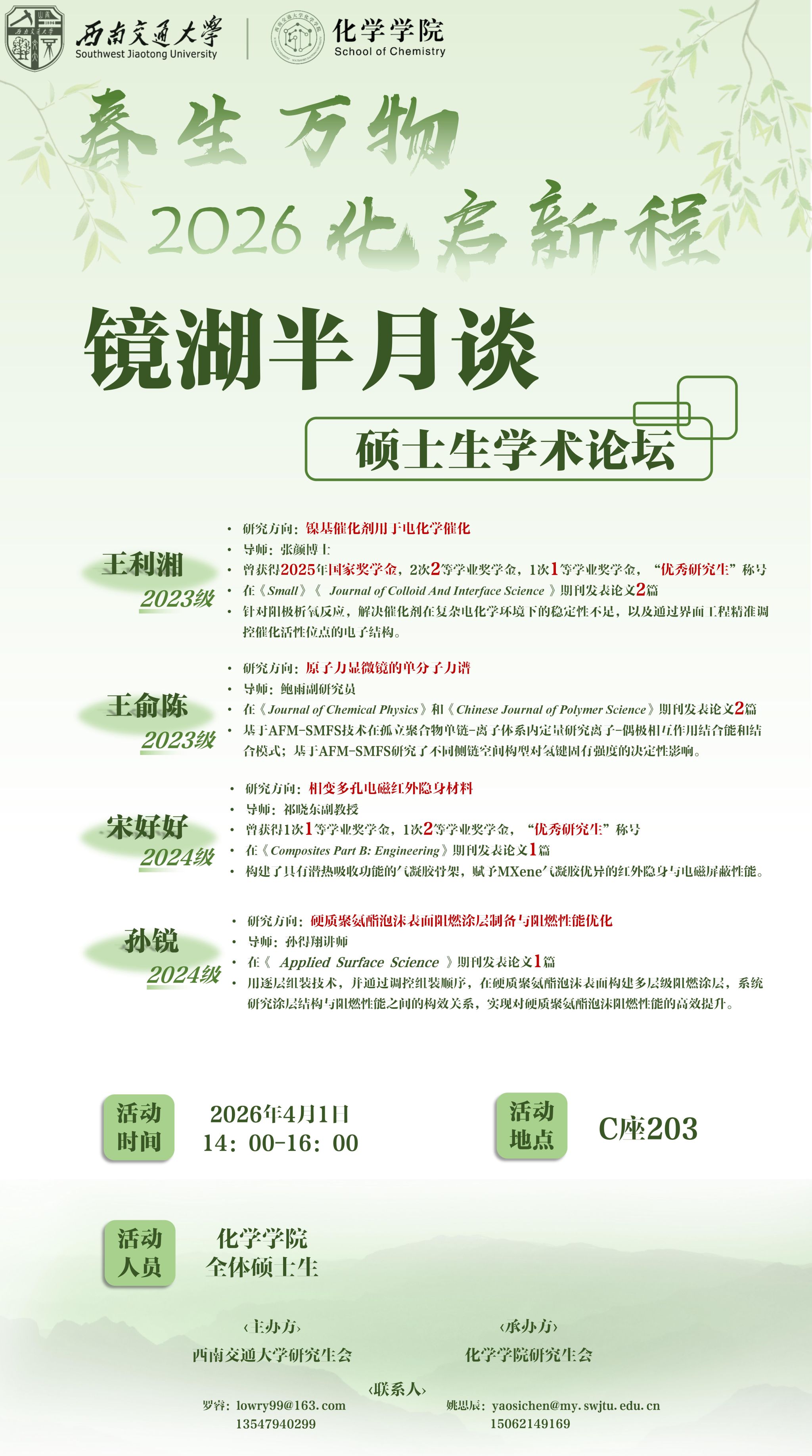 春回大地,万物复苏,恰如化学领域的科研探索——从基础理论的“生根”到创新成果的“发芽”,处处蕴含着突破与成长的力量。为搭建点点taptap官方网站硕士生学术交流平台,促进思想碰撞、提高创新思维、传承学术精神,助力科研“新苗”茁壮成长,点点taptap官方网站特承办点点taptap官方网站镜湖半月谈系列活动之点点taptap官方网站硕士生学术交流论坛专场。论坛主要围绕化学、材料学科方向进行交流研讨,首次活动将于2026年4月1日开启,邀你共启学术新程!
