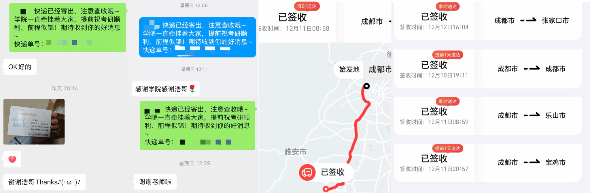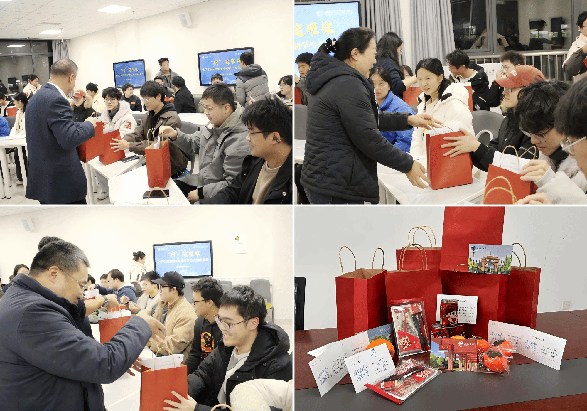 殷殷寄语暖心,聚力冲刺前行。活动现场,领导与老师们亲手为同学们送上特别的“暖心礼包”,凝聚着学院对考研学子美好的祝愿。礼包里面有学弟学妹们亲手书写的“笔锋所至,梦想开花”的明信片;好“柿”发生的解压捏捏乐;一战“橙”硕的新鲜水果;“下笔有神”的考试用具;“旺”气加持的旺仔牛奶。