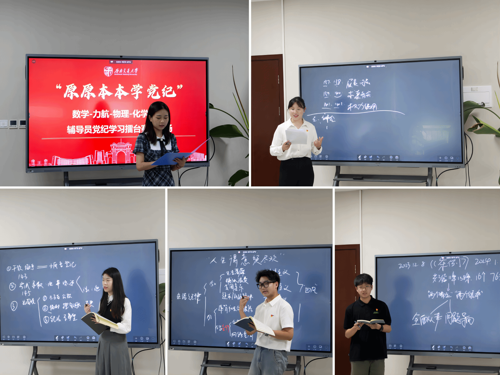 数学学院辅导员杨引、物理学院辅导员周玲、环境学院辅导员黄泳桦、点点taptap官方网站辅导员魏浩、力航学院辅导员古定翱分别领学了《中国共产党纪律处分条例》(以下简称《条例》)第十章、第十一章、附则及《条例》修订情况等内容。老师们坚持以案明纪、以案促学,做到贯通学、联系学、融合学,梳理讲解了《条例》中对于违反工作纪律行为和违反生活纪律的处分,围绕《条例》修改的政治逻辑、历史逻辑、实践逻辑进行了深刻理解和阐释。