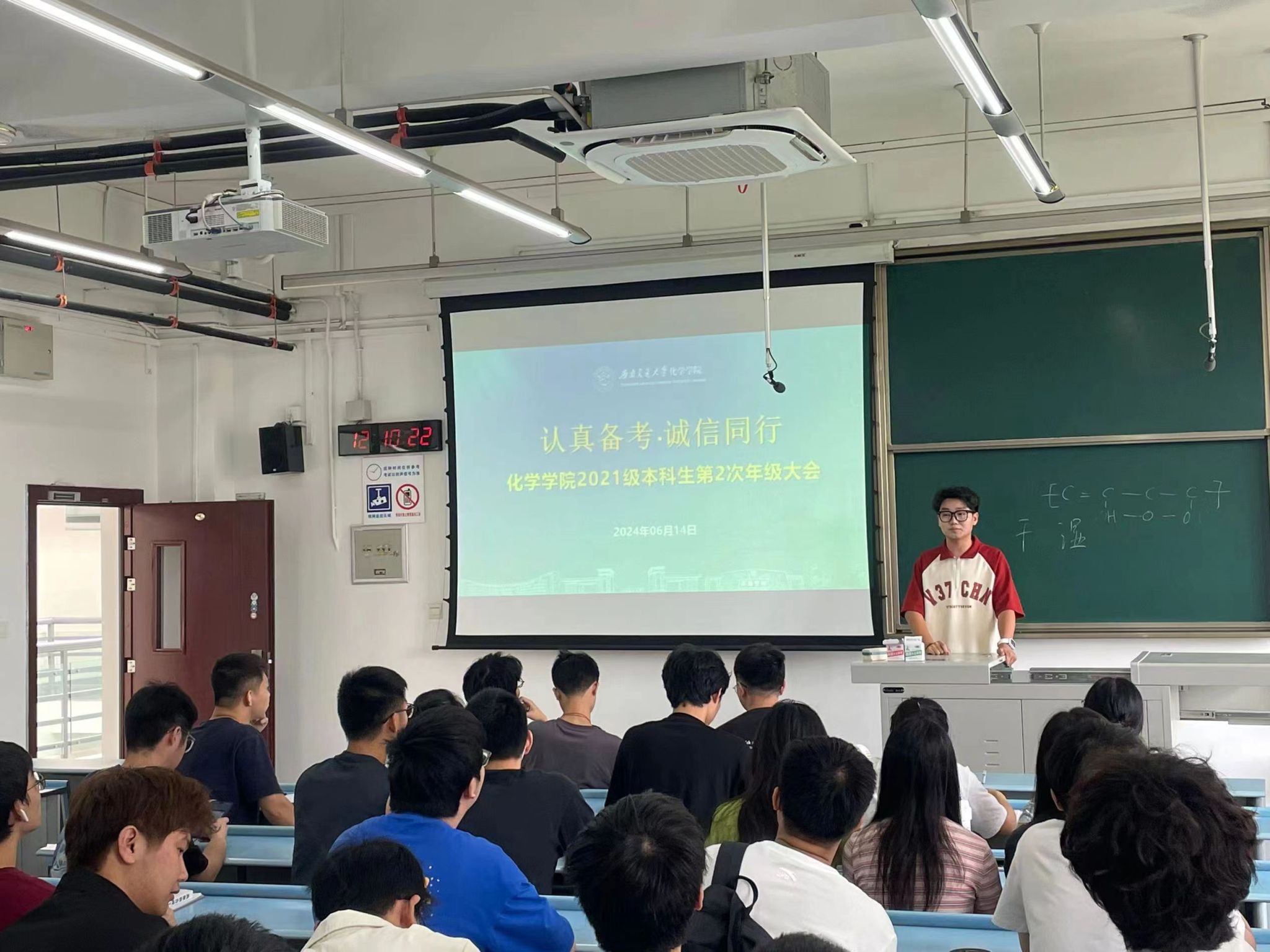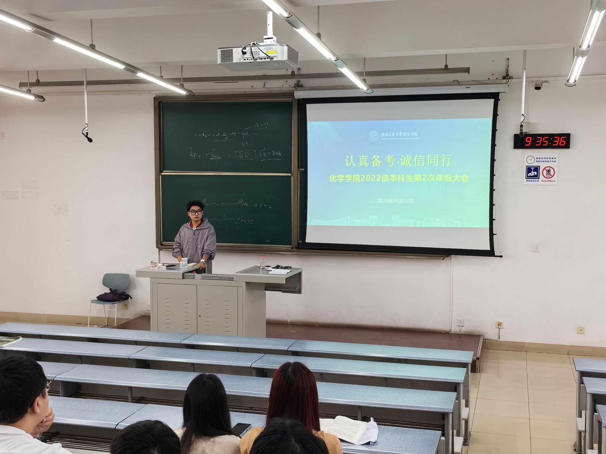 何芙馨老师面向全体本科2023级员工强调,要在态度上重视、行为上约束、考风上严肃,她详细为同学们讲解了考试流程、规则以及学校关于违反考试纪律和作弊的处理规定,并告诫同学们切勿抱有侥幸心理,规范自身行为,营造诚信考风。
