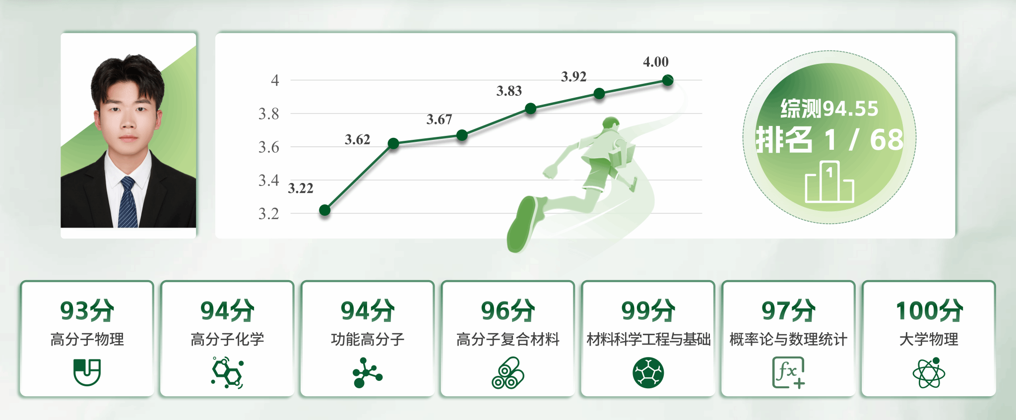 学业为基,以勤补拙。从大一的中游到三年的专业第一,逆袭背后是无数个清晨的图书馆与深夜的台灯。我梳理知识脉络,将理论联系实际:在《高分子化学》课上,以混凝土增韧案例讲解聚合机理;在《工程力学》中,用实验数据反推结构设计。最终,国家奖学金、三好员工标兵的荣誉,成为对坚持的最好注解。