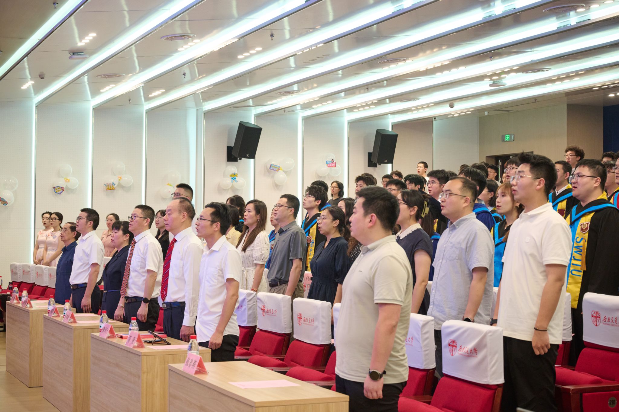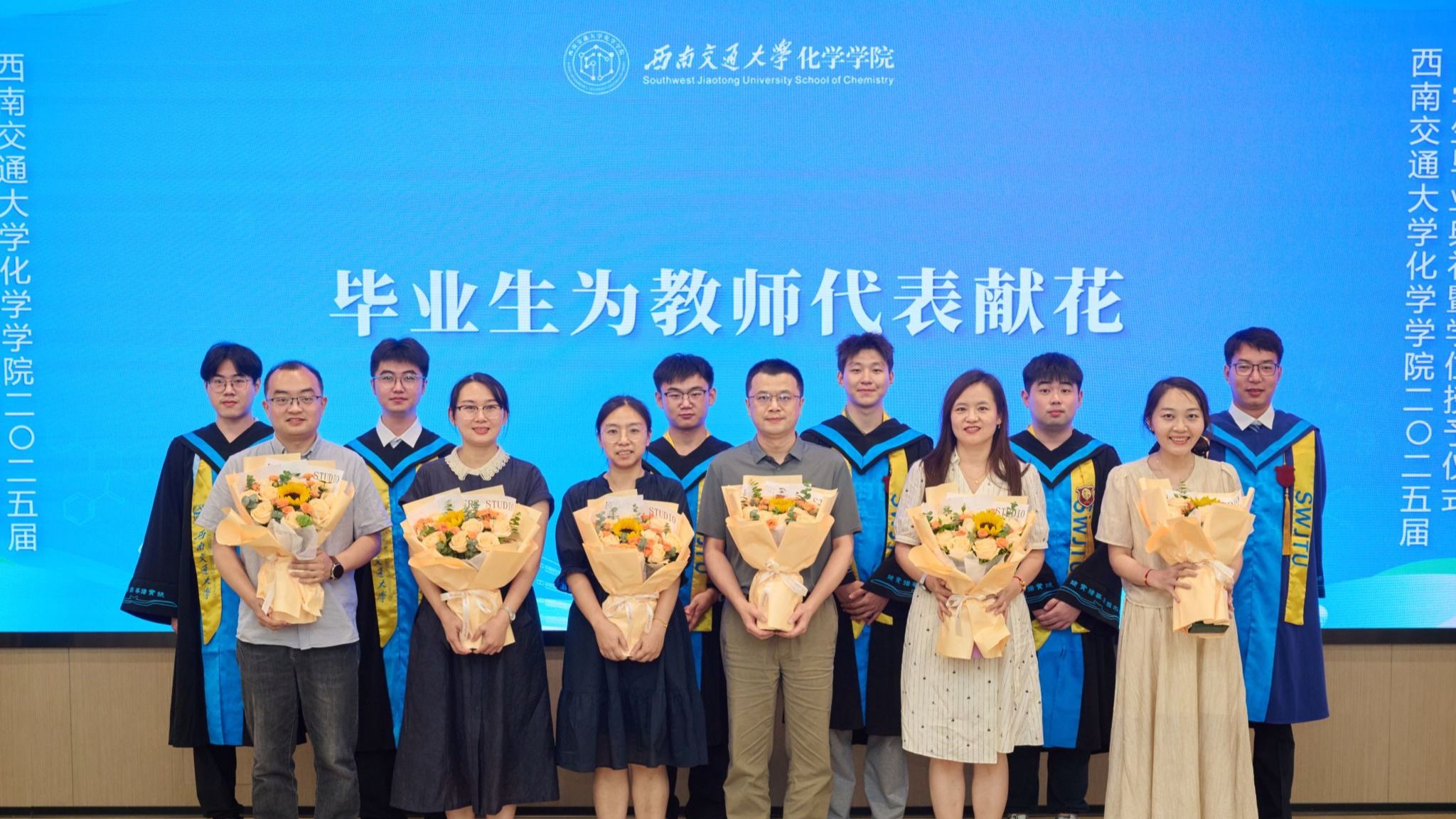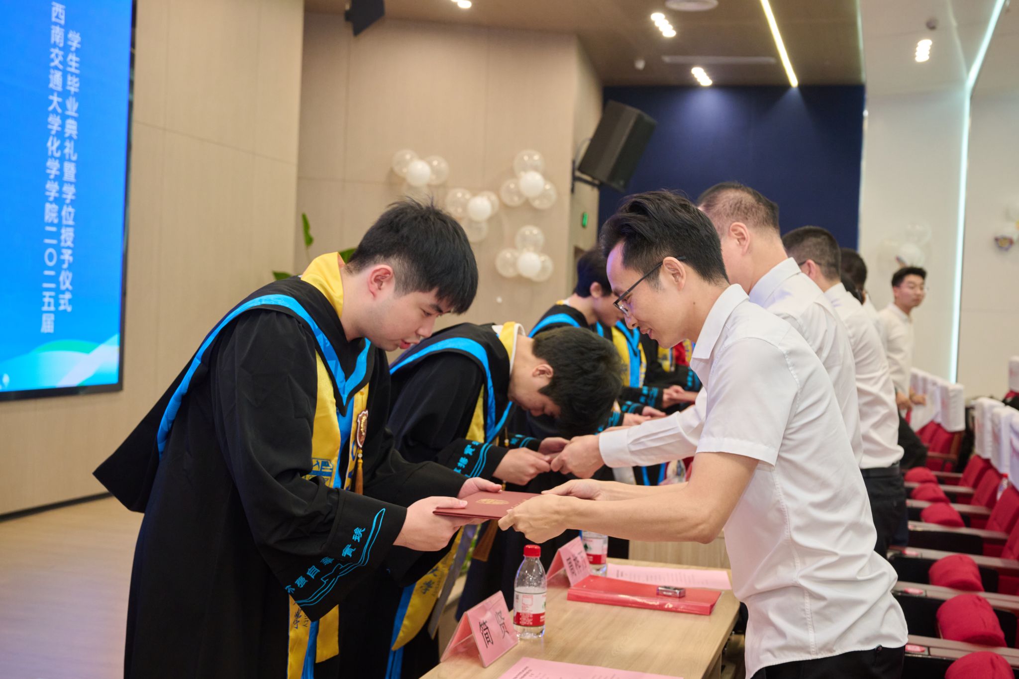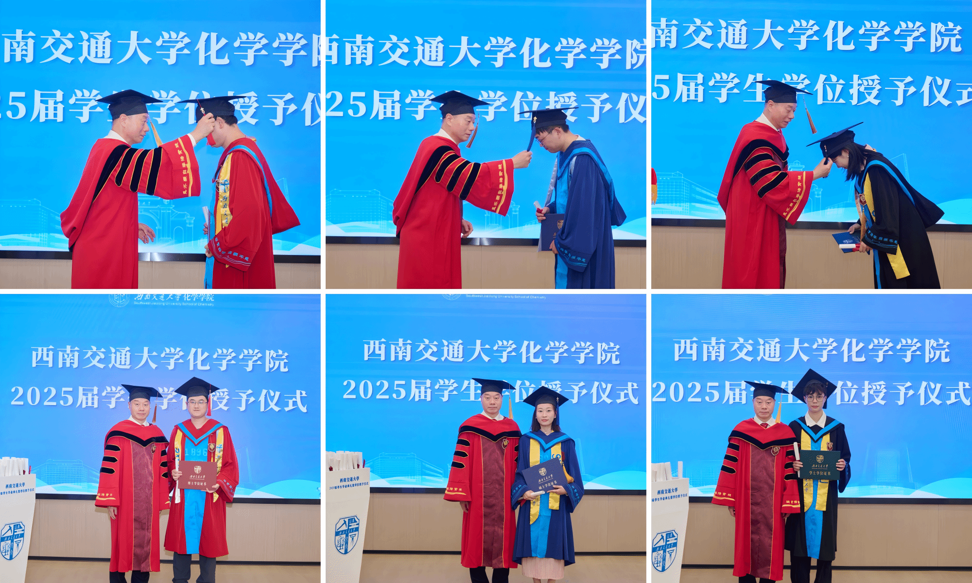 接着,学院举行了2025届员工学位授予仪式。周祚万经理逐一为2025届博士毕业生、硕士毕业生、本科毕业生授位。毕业生们依次上台接受经理拨穗授礼,并合影留念。