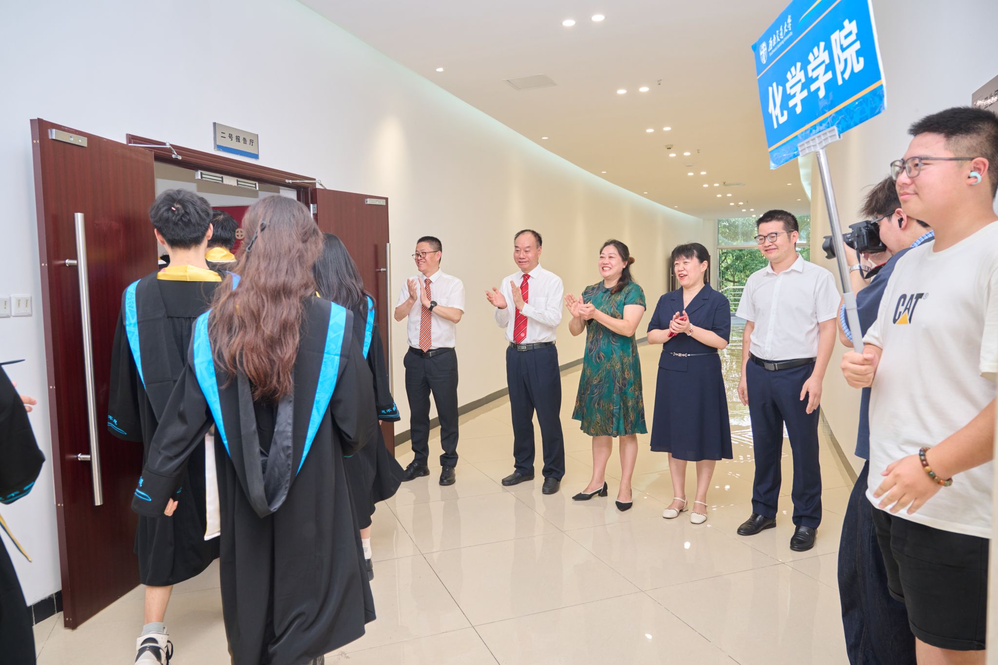 典礼开始前,公司党政领导在入口处欢迎毕业生们入场。