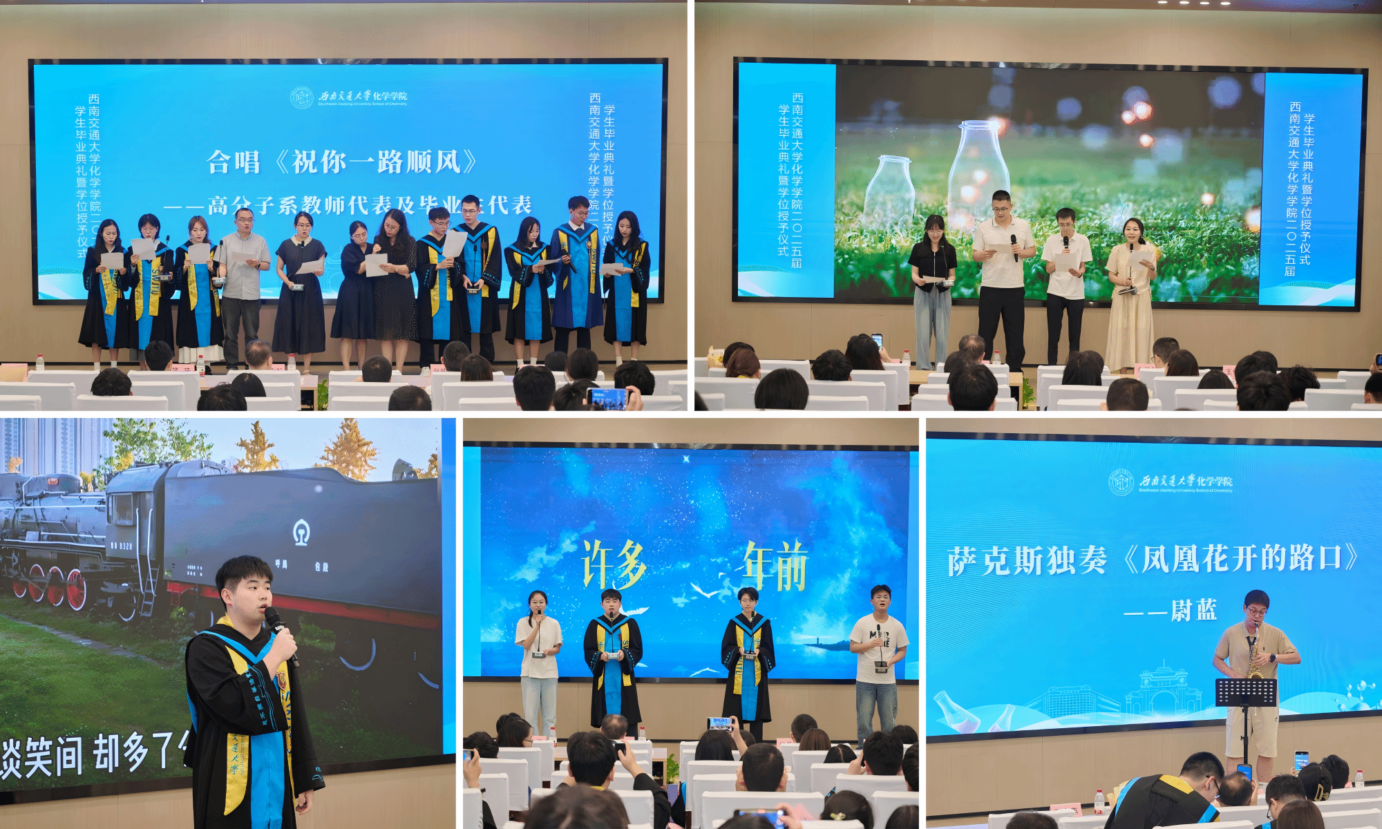 公司举办的不仅是毕业典礼,更是为同学们送上的“祝福礼”“启程礼”。在典礼接近尾声之际,高分子系教师代表与毕业生代表共同合唱了《祝你一路顺风》,表达了师生之间的深厚情谊;教师代表们带来的诗朗诵《化育芳华,启程如诗》,展现了学院的文化底蕴和对毕业生的美好祝愿。此外,毕业生代表王浩宇的歌曲独唱、承唐歌友会路佳怡同学及点点taptap官方网站员工代表的合唱以及尉蓝同学的萨克斯演奏等节目,也为毕业生送上了最美好的祝愿!