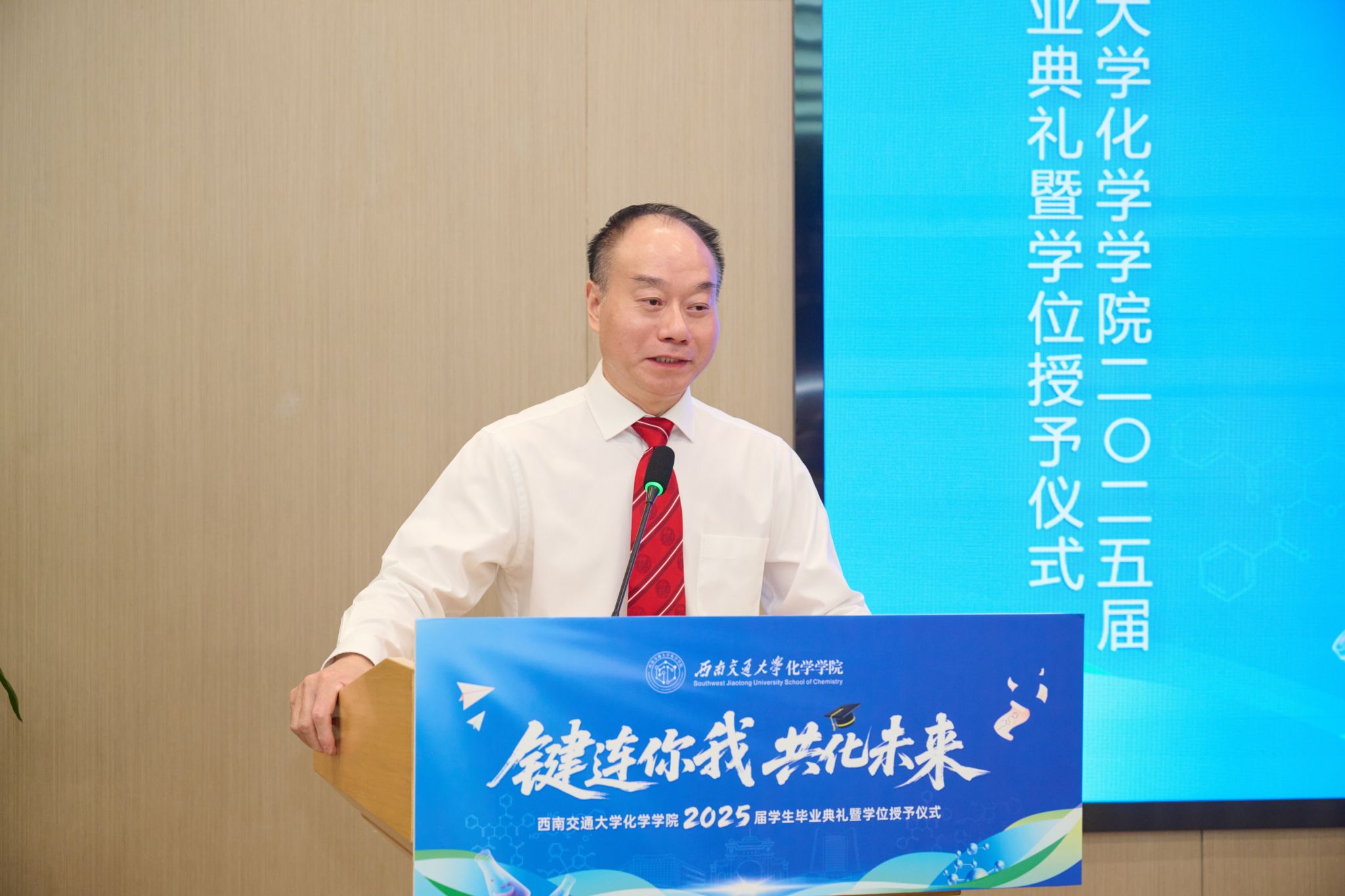 此次典礼还特别邀请了员工代表、电子科技大学材料与能源学院教授、博士生导师简贤发言。简贤员工于2003年至2013年(本硕博)就读于高分子材料与工程方向,他分享了自己的求学经历和职业发展历程,鼓励毕业生们要珍惜时光,不断进取,为国家和社会的繁荣发展贡献自己的力量。他的发言赢得了现场师生的热烈掌声。